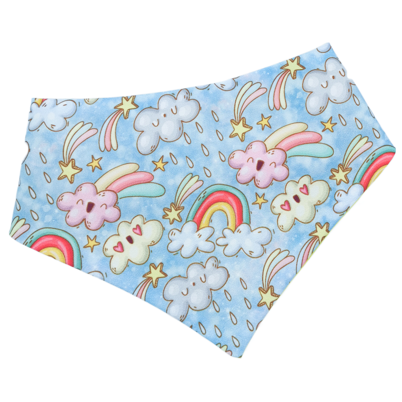 Designed to bring a delightful pop of colour and cuteness to your furry friend's wardrobe! With vibrant rainbows and a charming blue background, this bandana is a must-have accessory for any pet who loves to stand out from the crowd.
