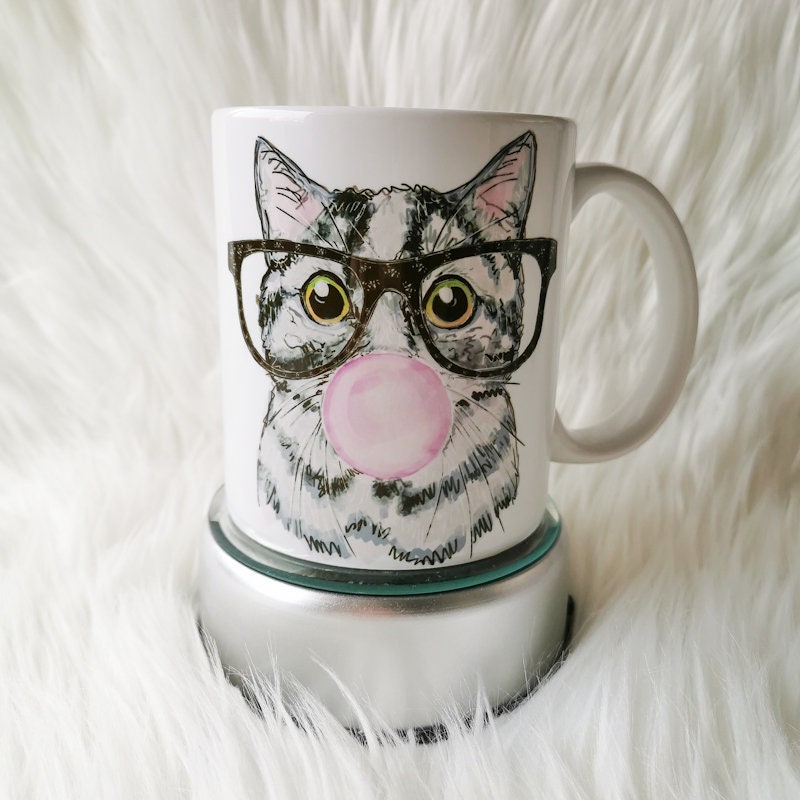 Step into a world of playful sophistication with our delightful cat bubble gum mug. Featuring an adorable image of a cat wearing glasses and blowing bubble gum, this mug is a perfect blend of cuteness, style, and a hint of mischievousness.