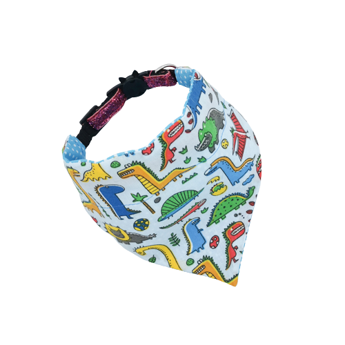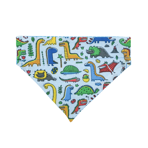 A whimsical accessory to make your furry friend the talk of the town! This charming bandana features a delightful blue backdrop adorned with a playful parade of cute dinosaurs, perfect for adding a touch of prehistoric pizzazz to your pet's style.
