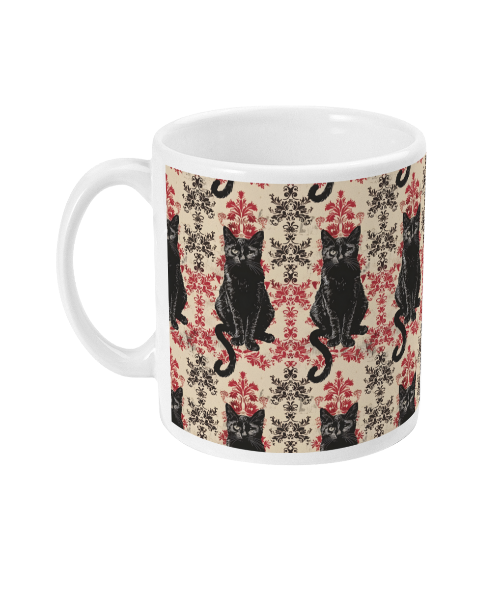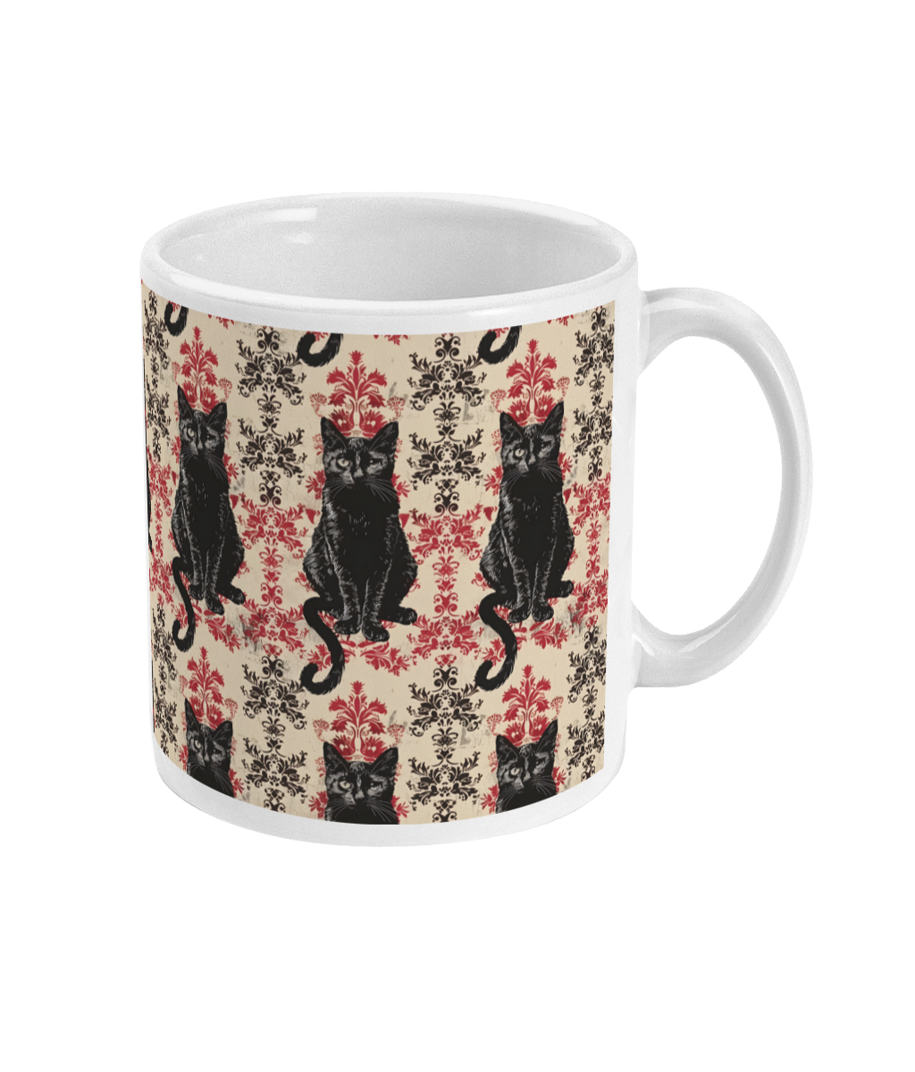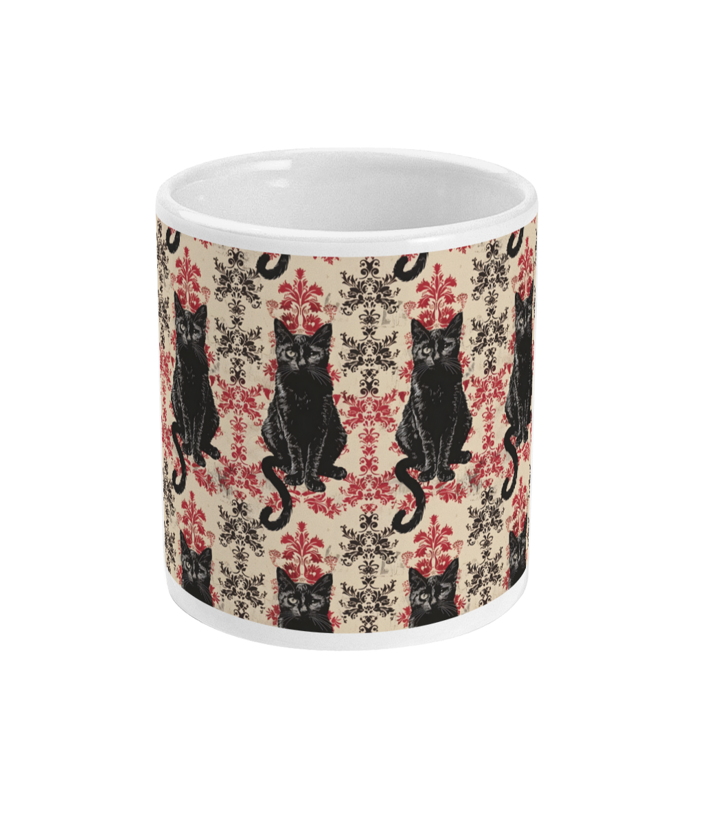 Featuring elegant cats framed by a rich red and black damask pattern. This striking design combines gothic allure with timeless style, making it the perfect choice for those who enjoy a touch of drama with their coffee or tea. Sip in sophistication with this captivating mug!