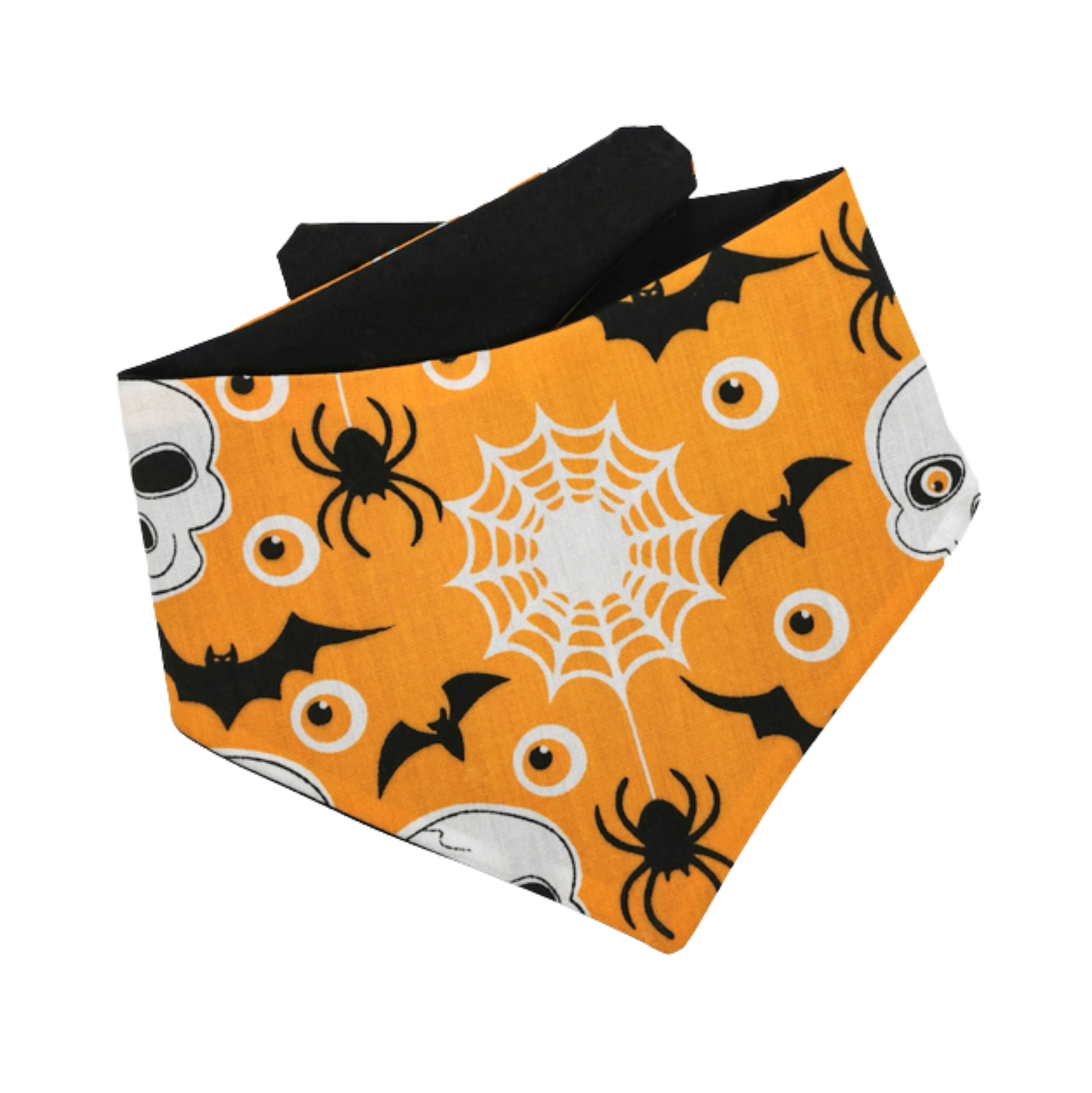 This hauntingly delightful accessory features a captivating design of skulls and bats on a bright orange background, adding a touch of spookiness to your pet's Halloween ensemble. This bandana showcases a captivating pattern of skulls and bats, creating an eerie and atmospheric vibe. It's the perfect accessory to embrace the spirit of Halloween and give your pet a hauntingly stylish look.