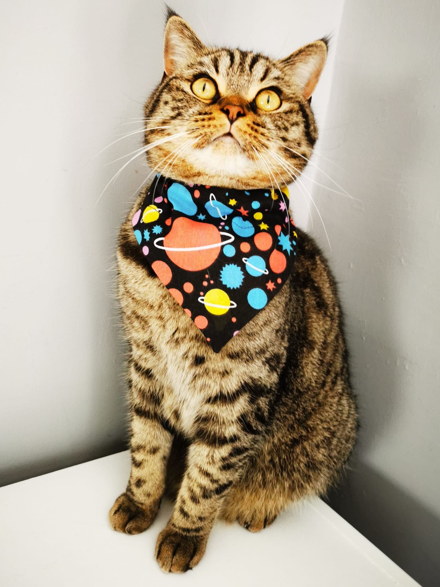 This stellar accessory features a mesmerizing space design that will transport your furry friend to the depths of the universe, making them the star of any occasion. Featuring a space-themed pattern, complete with twinkling stars, colourful planets, and celestial wonders. It's a design that captures the awe and wonder of the cosmos, allowing your pet to shine like a true star.