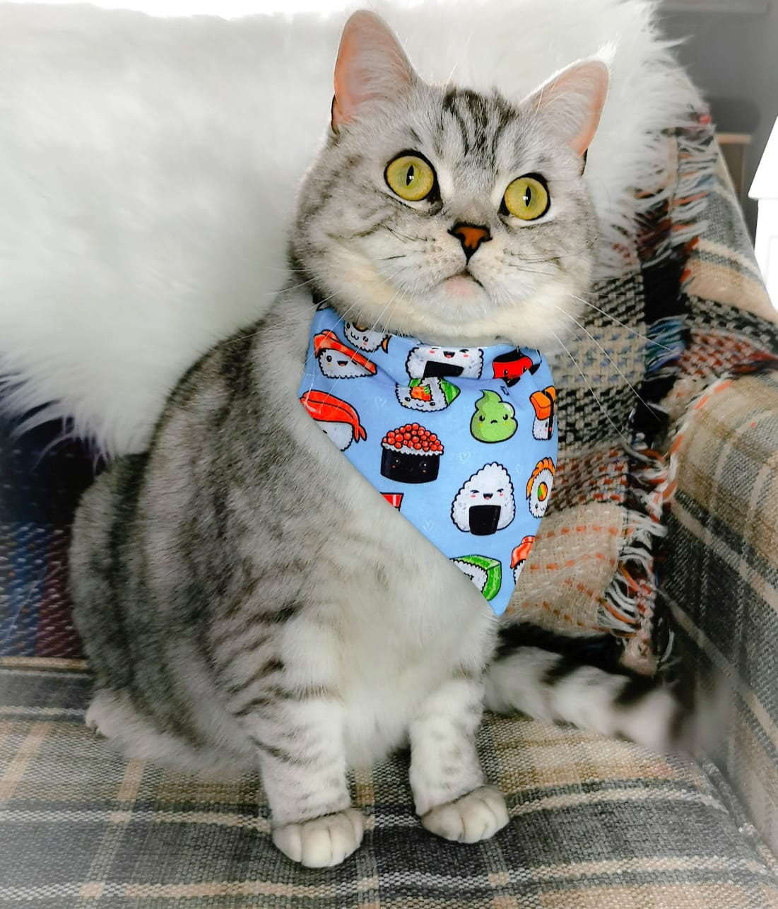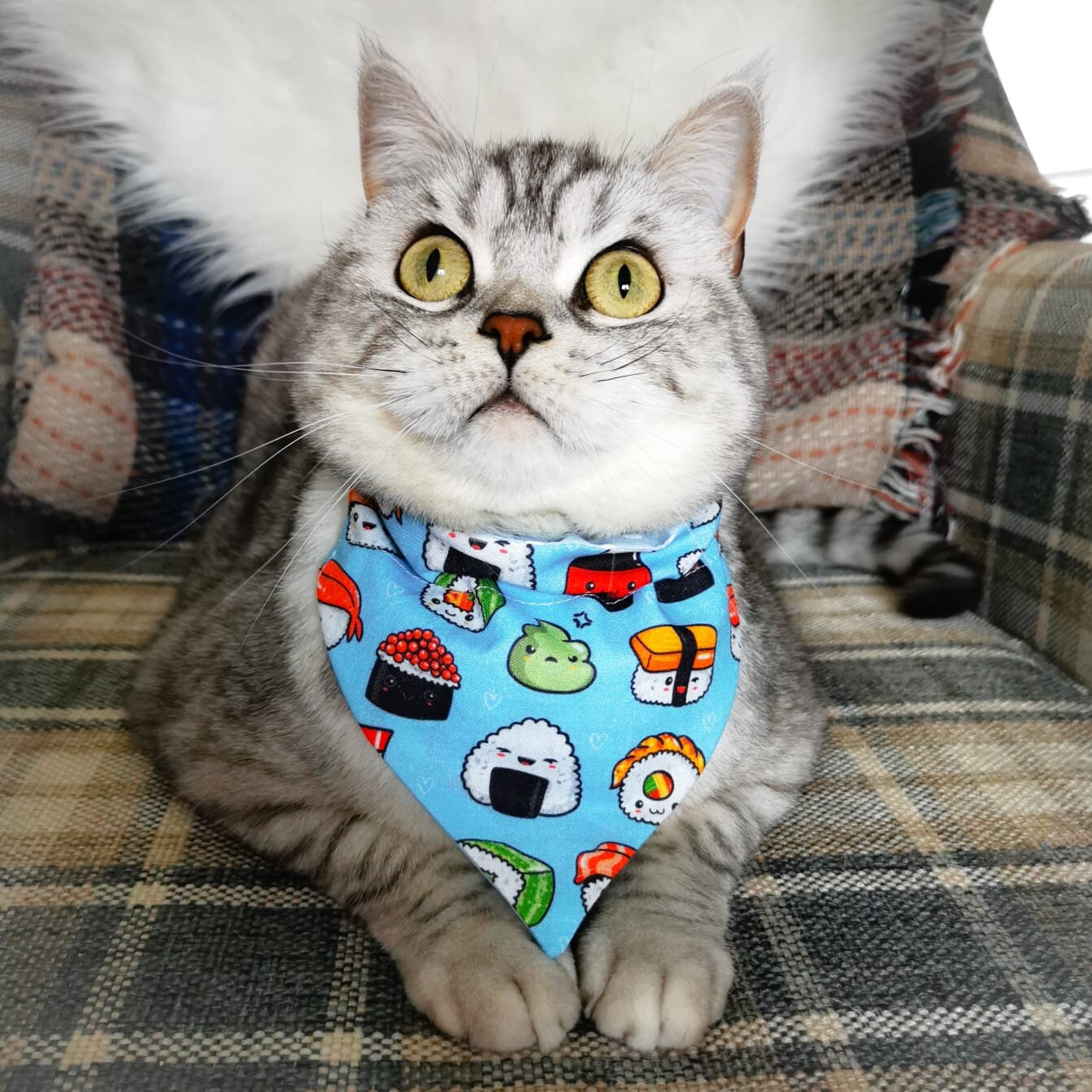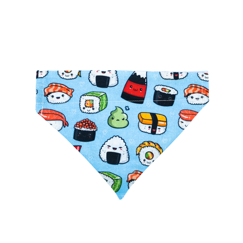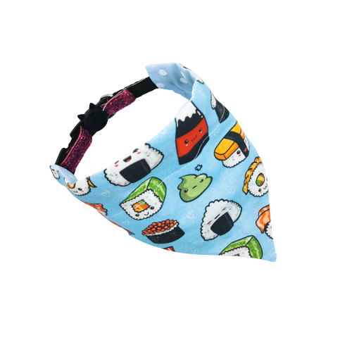 Treat your beloved furry friend to a feast of cuteness with our sushi bandana! Inspired by the mouth-watering world of sushi, this bandana features a delightful sushi-themed design that will make your pet the talk of the town. Let their style shine as they rock this deliciously adorable accessory on their daily adventures!